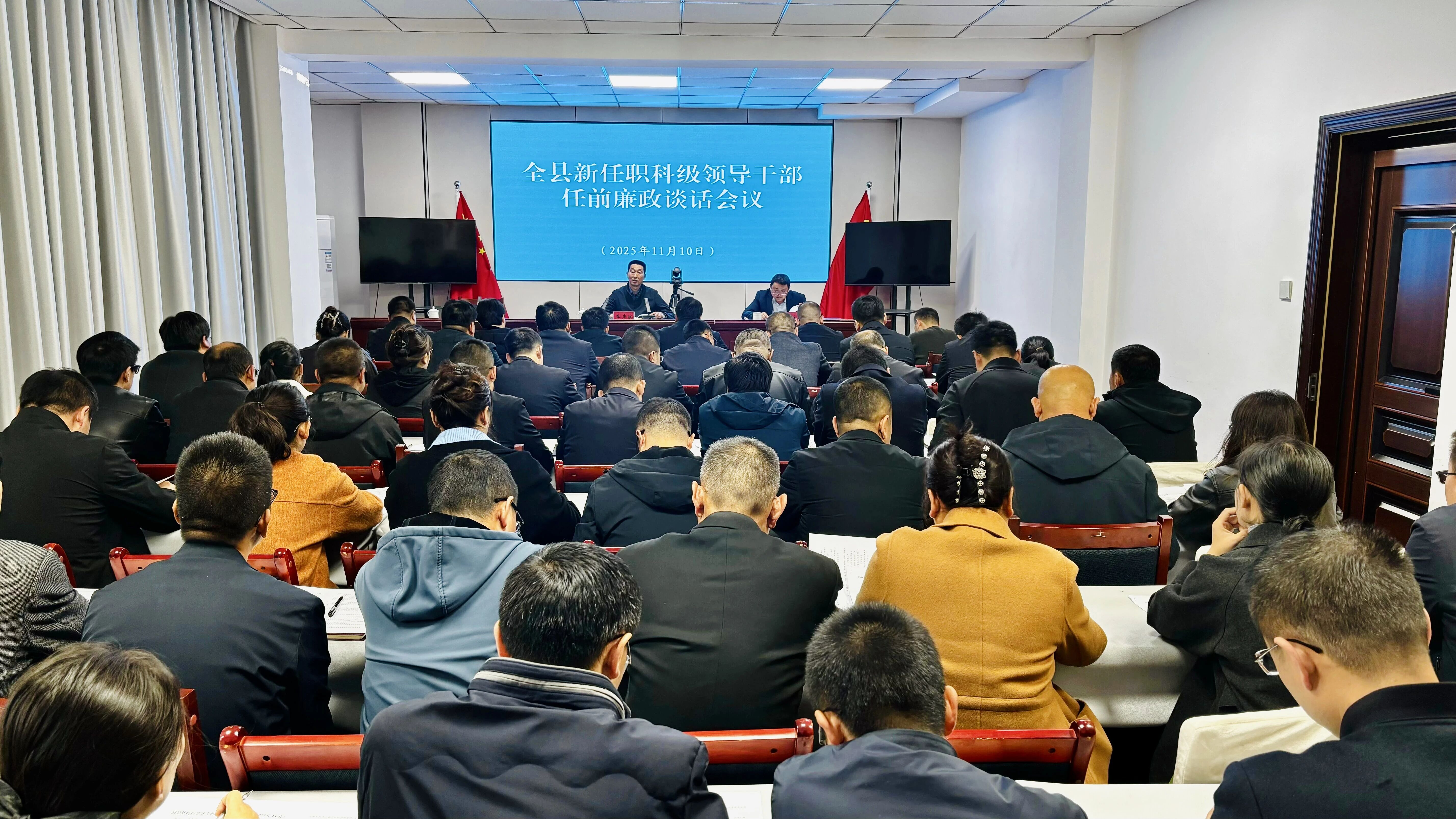 11月10日,全县新任职科级领导干部任前廉政谈话会议召开。县委常委、县纪委书记、县监委主任李彦斌出席会议并讲话。县委常委、县委组织部部长王永民主持会议。